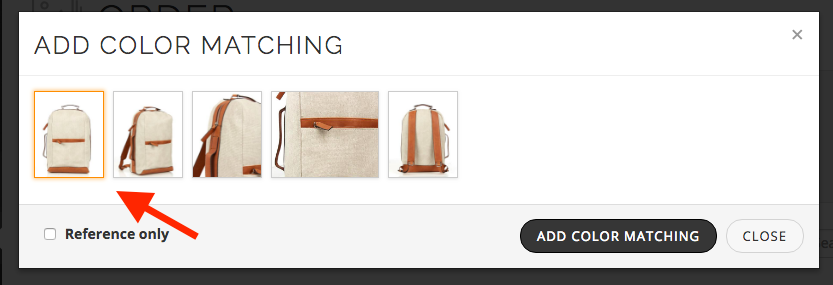I have five images of a backpack. They were shot at the same time in the same setup, but I’m concerned that different zoom lengths could affect the color. So when I’m placing my regular retouching order, I decide to use Color Matching.